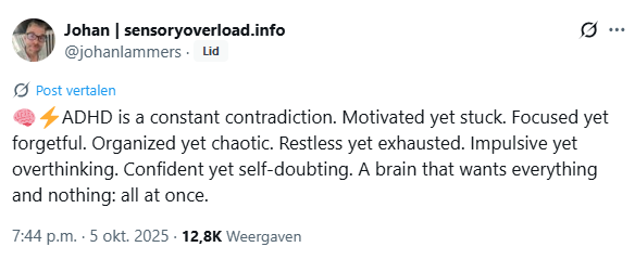 My name is Johan Lammers, founder of Sensory Overload and an AuDHD coach. I have lived experience with ADHD, autism, anxiety, burnout, and depression. Experiences that shaped my life, my understanding and my mission. Over the past years, I’ve dedicated myself to researching how neurodivergent minds work. I’ve learned to help myself, and now I’m here to help others do the same.